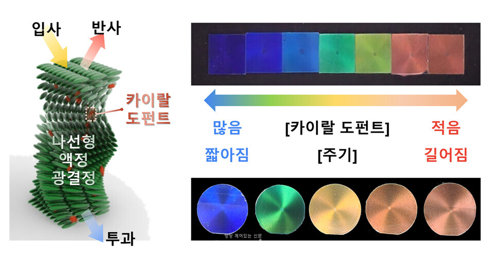 연구팀은 굴곡진 나선형 액정 결정성 고체와 유동성 액체의 중간 성질을 갖는 물질로서 온도, 전기장 등에 의해 정렬 특성이 바뀌는 광결정을 제작해 이러한 문제점을 해결했다.