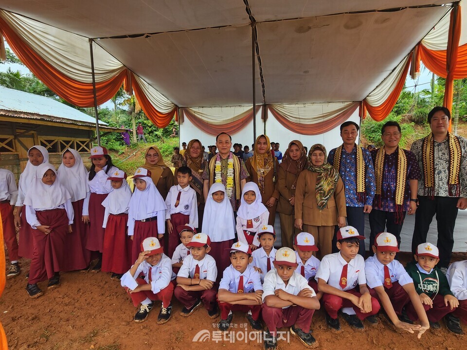 한국중부발전이 인도네시아 수마트라섬 땅가무스군 지역 초등학생들의 안전한 등하교를 위해 통학버스를 기증하고 학교 현판식을 개최했다.