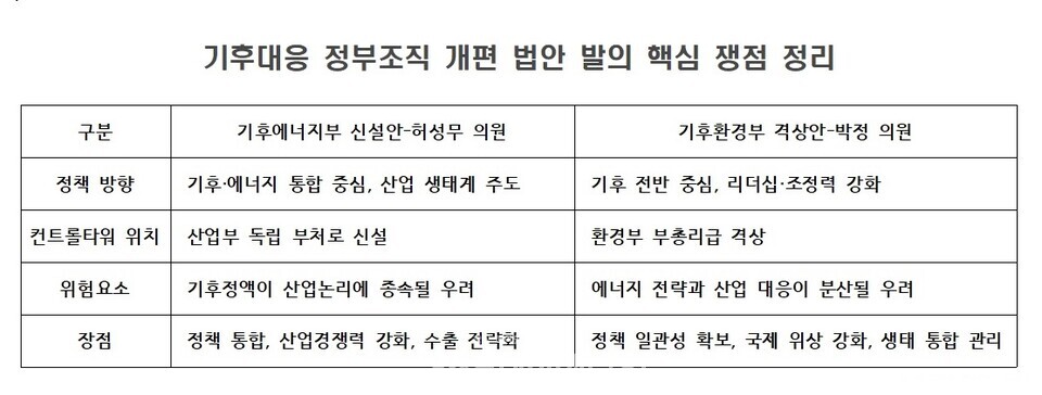 문제는 두 법안 모두 기후정책 추진의 필요성엔 공감하면서도, 정책 주도권과 철학이 충돌한다는 점이다. 기후에너지부가 신설될 경우 환경부와의 업무 중복, 예산 배분, 정책 우선순위 충돌 등이 불가피할 수 있다.
