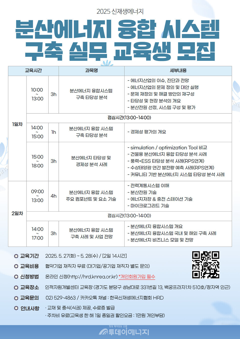 [투데이에너지 이상석 기자] 한국신재생에너지협회는 오는 27, 28일 양일간 분산에너지 융합시스템 구축 실무 교육생을 모집한다.
