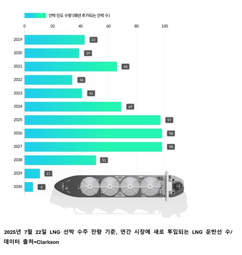 현재 건조 중인 LNG선은 303척에 달하며, 2026~2027년에 각각 98척씩 인도될 예정이어서 공급 과잉 문제는 더욱 심화될 전망이다. 구형 증기터빈 방식의 선박 209척이 전량 퇴출된다고 가정해도, 이로는 공급 증가분을 상쇄하기 어렵다는 분석이다.