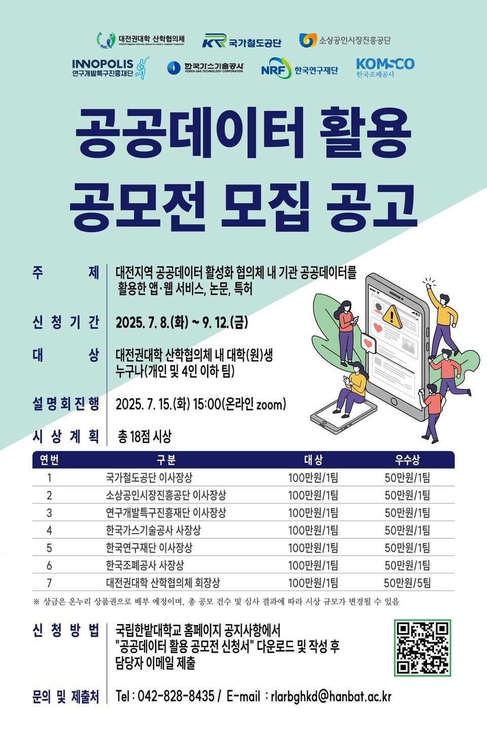 이번 공모전은 오는 9월 12일까지 접수를 받으며, 참가자들은 각 기관이 보유한 공공데이터를 결합·융합해 지역 현안을 해결하는 웹·앱, 논문, 특허 아이디어 등을 제시하게 된다. 총 상금은 1250만 원이며, 최종 18개 팀이 선정되어 기관장 명의의 상장과 멘토링 기회를 제공받는다.