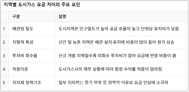 도시가스는 난방, 취사, 온수 등 생활필수 에너지원임에도 불구하고, 농촌과 저소득 지역일수록 상대적으로 비싼 요금을 부담하는 구조가 고착화될 수 있다는 우려가 나온다. 정부는 이러한 지역격차를 줄이기 위해 △국가 차원의 배관망 투자 확대, △요금 산정구조의 합리화, △에너지 취약계층에 대한 지원 강화 등 제도 개선을 검토 중이다.