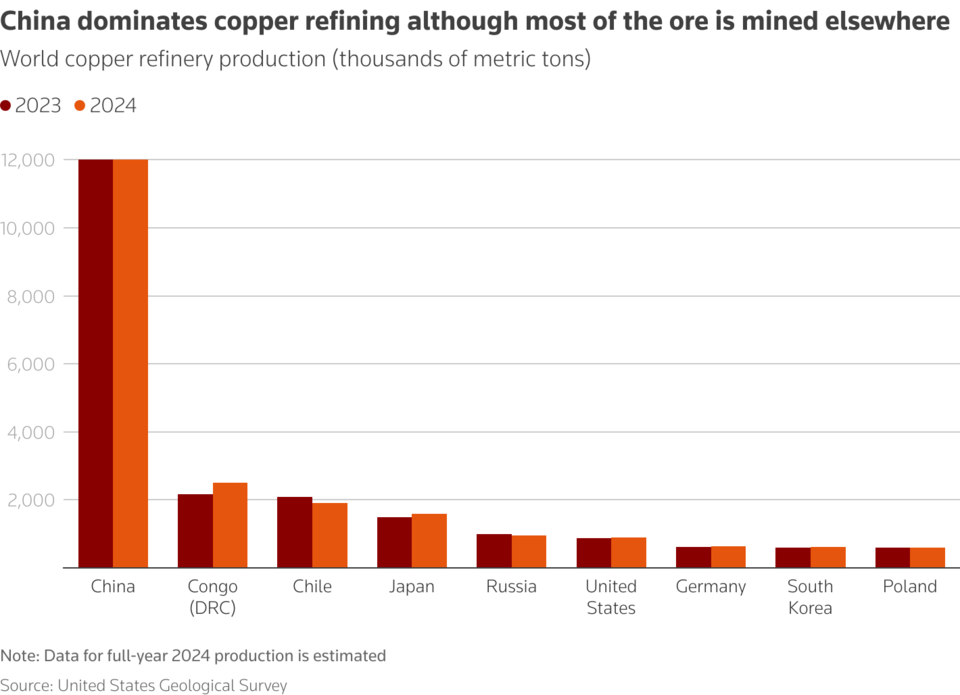 중국이 세계 구리 정련을 주도하고 있지만, 중국 제련소에 공급되는 광석의 대부분은 라틴 아메리카에서 채굴된다. USGS에 따르면 칠레와 페루는 작년 전 세계 구리 생산량의 약 3분의 1을 차지했다.